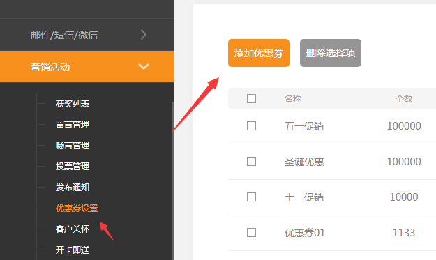 ①.后台---营销活动---优惠券设置里添加新的优惠券