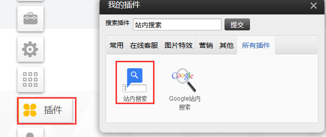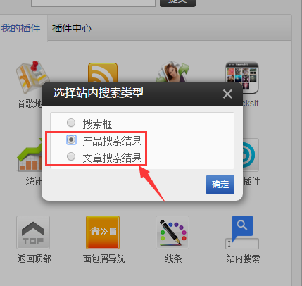 ①.添加站内搜索插件,选择搜索框,点击确定。