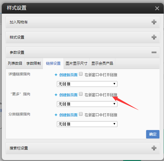 ⑧.需要注意的是,点击参数设置,设置列表的链接指向,如下,需要链接到带有产品详情插件的页面。其余的列表数目,字数限制,图片显示尺寸,显示会员产品可自行按需设置